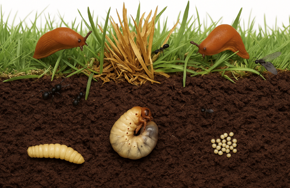 - Schnakenlarven: Sie leben knapp unter der Grasnarbe und schädigen Grashalme und Wurzeln.