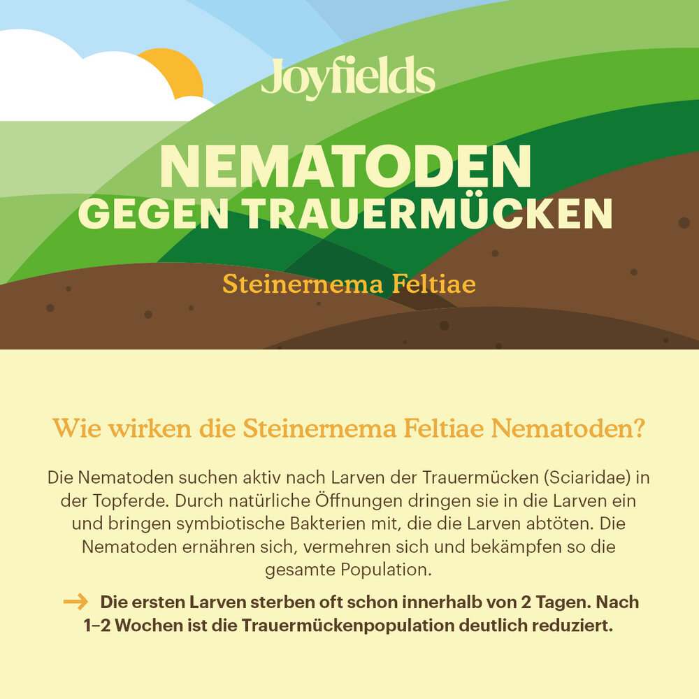 Mit Steinernema feltiae-Nematoden bekämpfen Sie Trauermücken natürlich und effektiv, ganz ohne Chemie. Die Nematoden suchen aktiv nach den Larven in der Blumenerde und vernichten sie gezielt.
