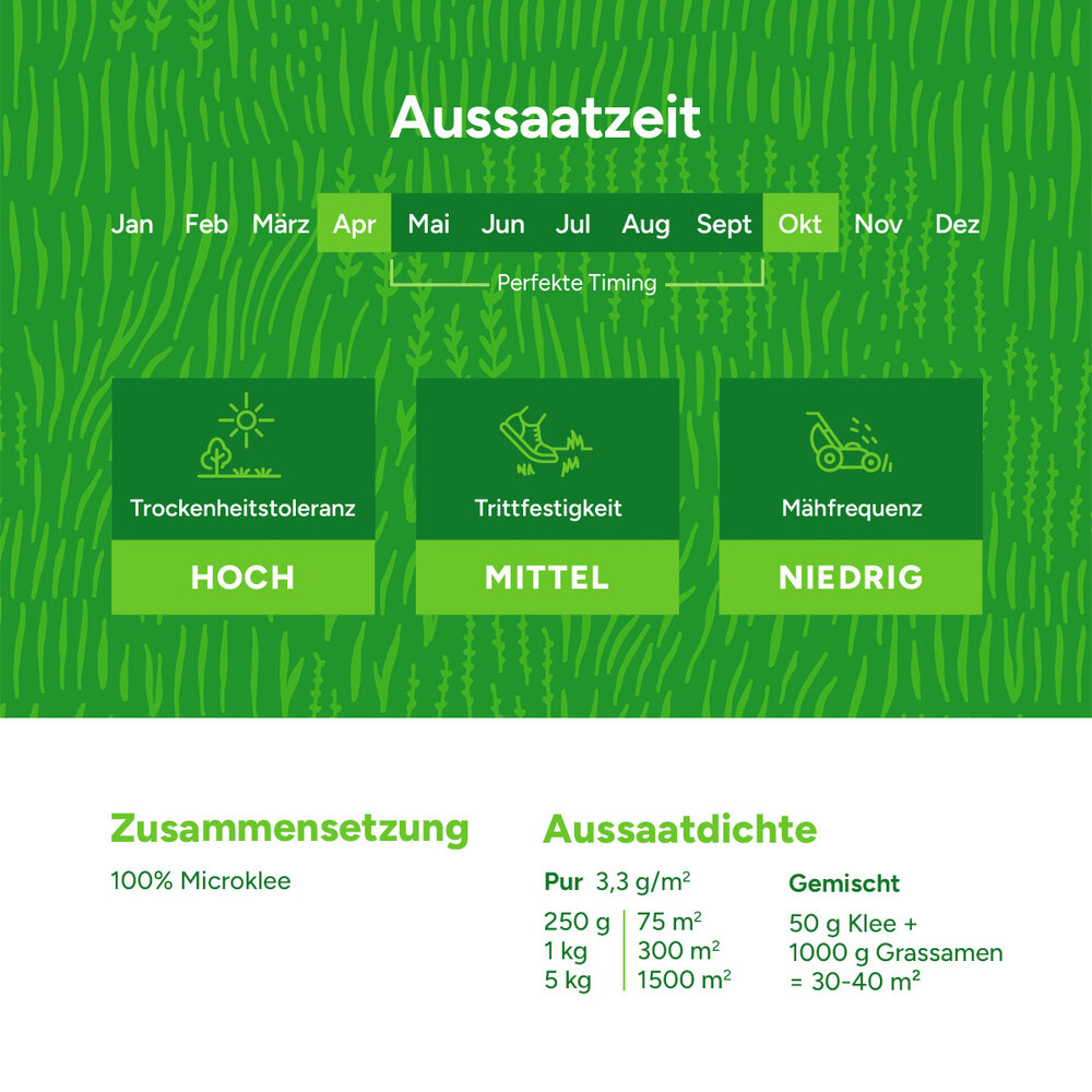 - Aussaatdichte pur: 50 g/ 15-20 m² | gemischt: 50 g Klee-1000 g Grassamen/30-40 m²